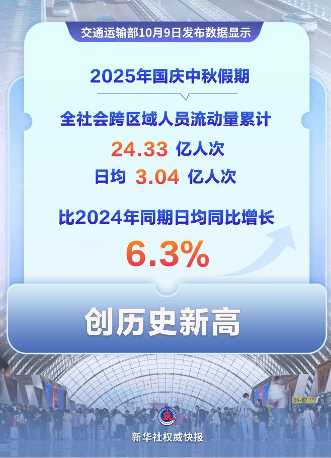 2025年国庆中秋假期落下帷幕,这个长达8天的“超级黄金周”交出了一份亮眼的成绩单。据交通运输部数据显示,假期全社会跨区域人员流动量预计达24.32亿人次,日均同比增长6.2%。