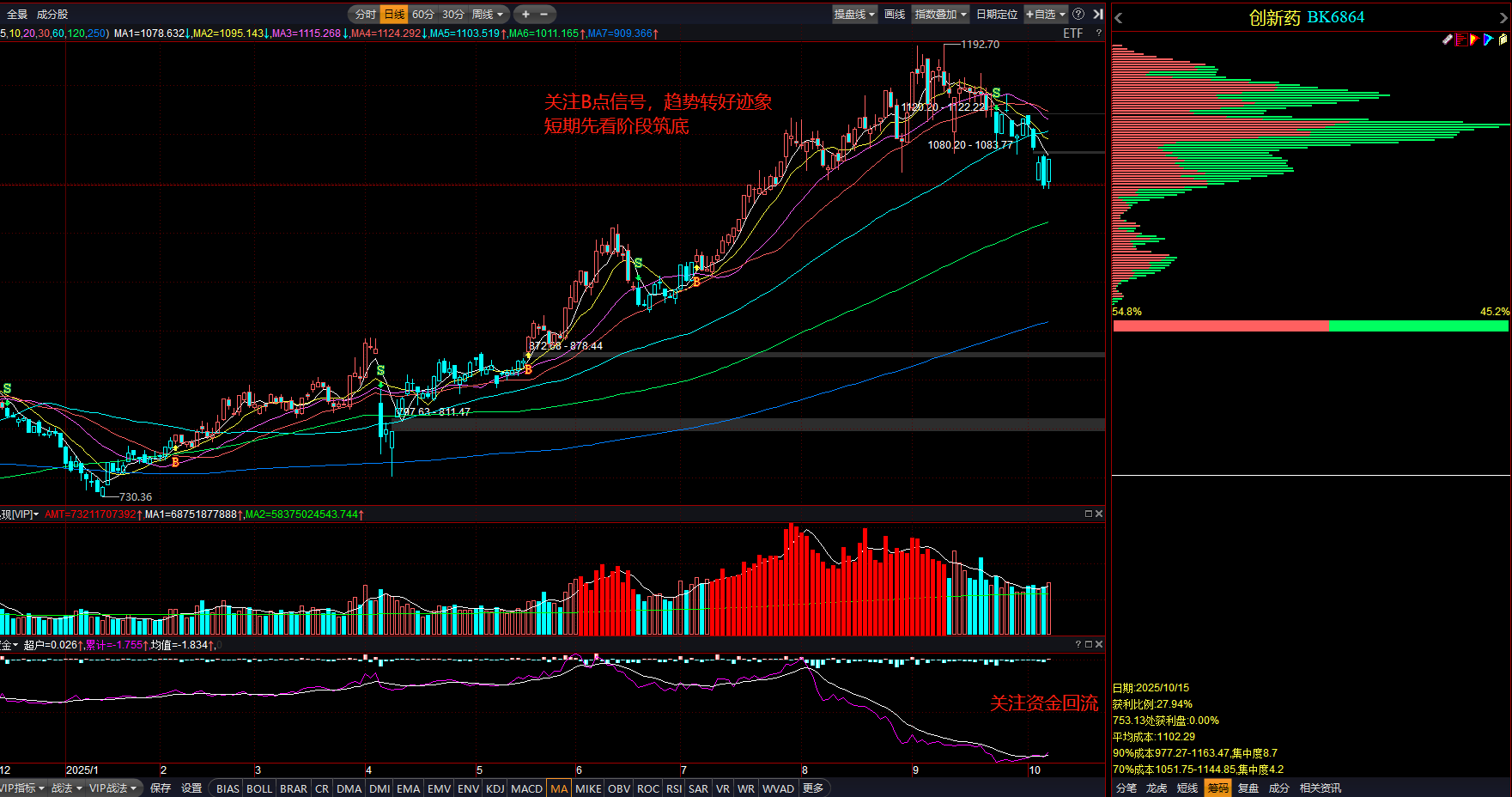3、板块方面:创新药此轮出现一波中级别调整,跌破上一波趋势线,短期来看两阳夹一阴,资金小幅回流有阶段筑底迹象。接下来重点关注资金持续回流迹象以及操盘线B点信号,留意低吸潜伏机会。